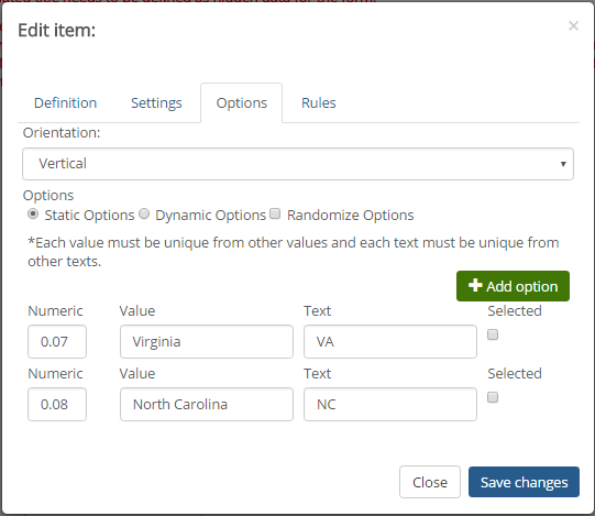 If the radio button options impact a final balance on the form, enter the numeric amount to be used in the balance calculator. For example, for the question , "What state will this product be shipped to?", the options might be "VA" or "NC". Since each state might require a difference tax percentage to be applied, the Numeric might be 0.08 for VA and 0.07 for NC, which would be used to calculate the final balance. Example