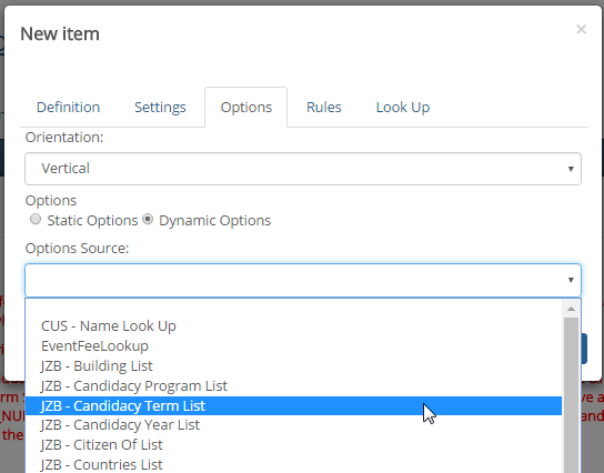 Static options let you enter specific options that form users can select. They are specific to the form and populated from your J1 or external database.