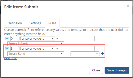 Rules consist of conditions, answers values, and actions. Example. To set up a rule, you must add it to a question or field. Rules must ALWAYS have an If answer value is condition in the first statement of the sequence.